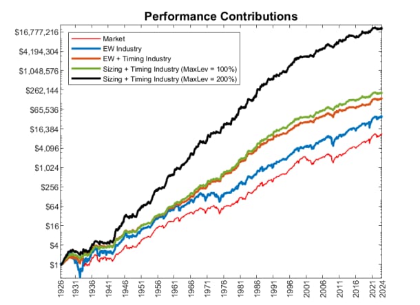 The study demonstrates how a long-only, trend-following strategy applied at the industry level can significantly outperform a passive market investment while drastically reducing risk.