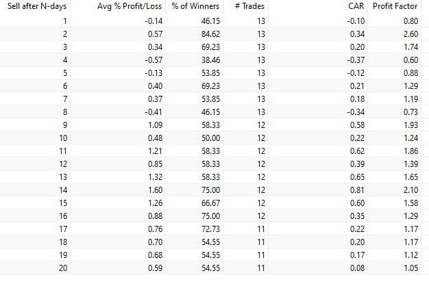 Each row shows the result of selling after 1-20 days. For example, after 10 days, the average return is 0.48%, but the results vary a lot. Thus, opposite to the stock market, where most big down days perform well in the days after, gold is different.